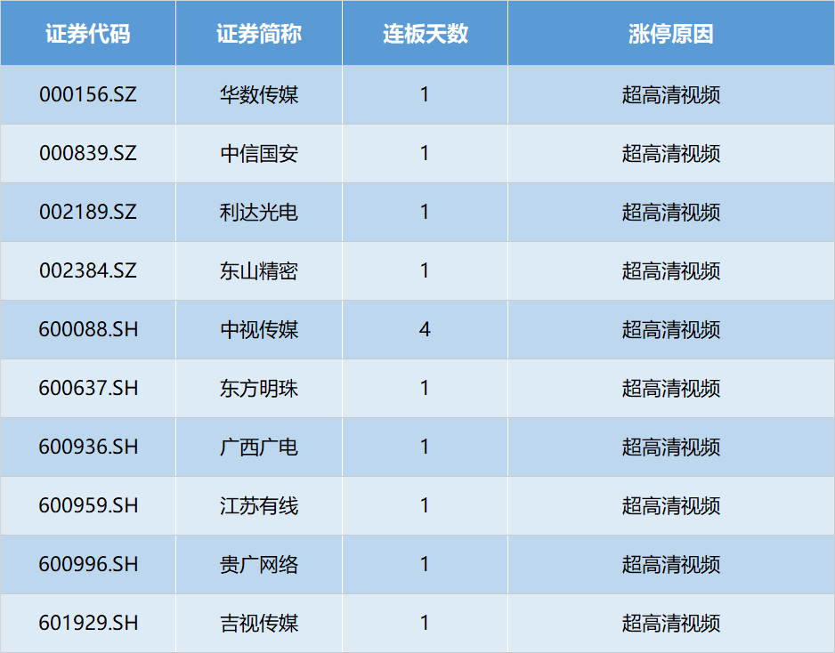 超高清视频板块今日表现强势,华数传媒(000156.SZ)、中信国安(000839.SZ)、利达光电(002189.SZ)、东山精密(002384.SZ)、中视传媒、东方明珠(600637.SH)、广西广电(600936.SH)、江苏有线(600959.SH)、贵广网络(600996.SH)、吉视传媒(601929.SH)纷纷迎来涨停。消息面上,工信部等部委于19年3月,印发《超高清视频产业发展行动计划(2019-2022年)》,到2022年我国超高清产业总体规模将超过4万亿元。