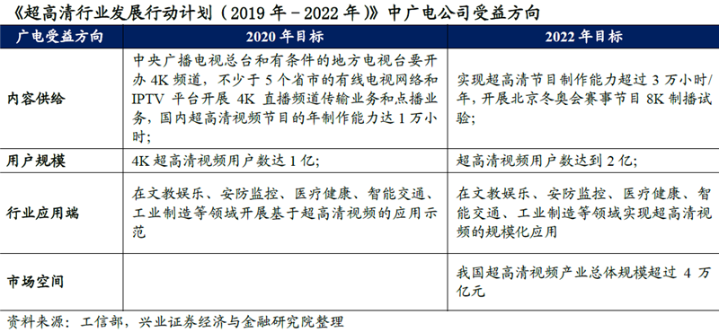 兴业证券认为,在《行动计划》目标的4万亿规模中,超高清内容供给及应用、显示终端产品是其中规模最大的两部分,预计广电公司相关的超高清内容供给和行业应用端在2022年的产业规模将高达2万亿元。超高清视频将成为广电公司新的发展机会。