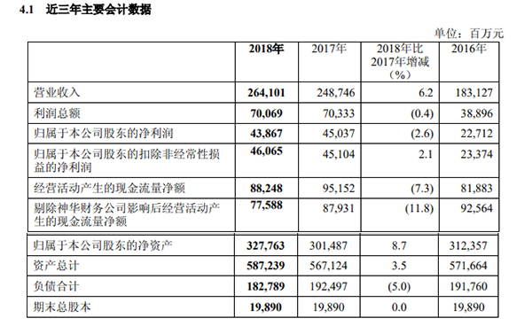 3月22日,中国神华披露了2018年年报,2018年营业收入2641亿元,同比增长6.2%,净利438.67亿元,同比减少2.6%;基本每股收益2.205元,同比下降2.6%。中国神华拟每10股派8.8元,总计派息175.03亿元。