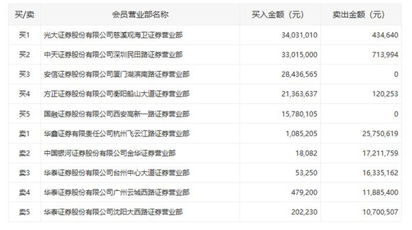 22日, 交易所公布的盘后数据显示, 买入和卖出前五席位均为券商营业部。 光大证券慈溪观海卫和中天证券深圳民田路分别买入超3000万元。
