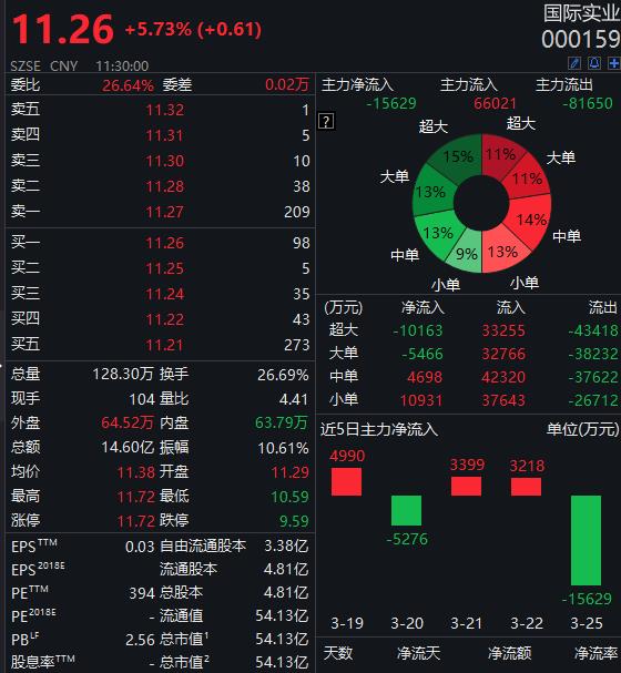 今日早盘,国际实业高开后再度封涨停,但不久打开涨停板。截至午间收盘,国际实业涨近6%,报11.26元,成交额14.6亿元,换手率26.69%。