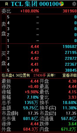 3月25日,TCL集团涨停,报4.44元,换手率10.6%,成交额59.75亿元。
