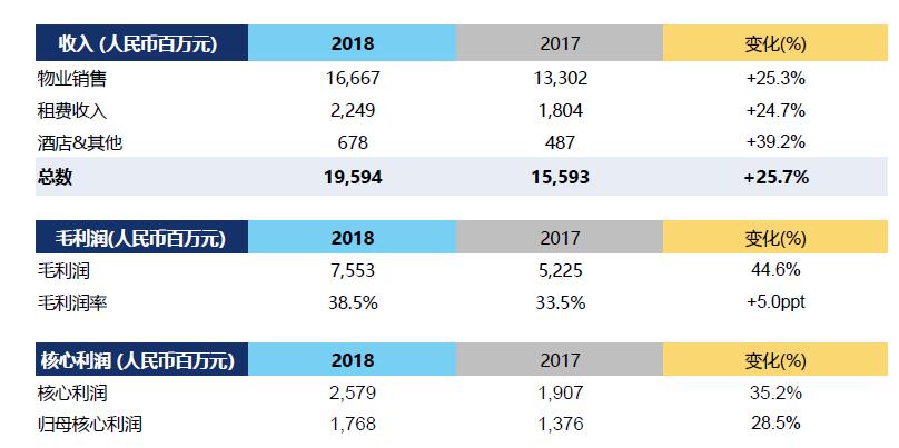 截止2018年12月31日,宝龙地产合约销售金额达人民币410.36亿元,较2017年同比增长97%;总收入为人民币195.94亿元,较去年同期增长26%;租金及物业管理服务收入为人民币22.49亿元,较2017年同比增长25%;毛利率38.5%,居行业领先水平;核心盈利达人民币25.79亿元,较去年同期增长约35%。