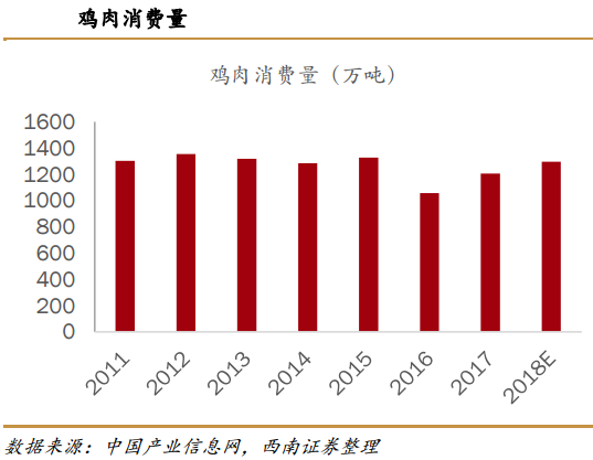 自2016年以来,鸡肉消费量总体呈上涨趋势。2018年四季度以来,猪肉消费出现一定程度的下滑,鸡肉是猪肉的最好替代品,人们对鸡肉的消费增加,使鸡肉的替代需求大幅增长,鸡价也有望继续上涨。西南证券预计未来半年,禽养殖板块景气度继续高涨,未来两年鸡肉消费量将持续上涨趋势。受利润增加的影响,养殖企业将会加大鸡苗供给。