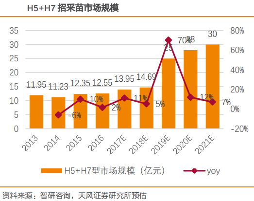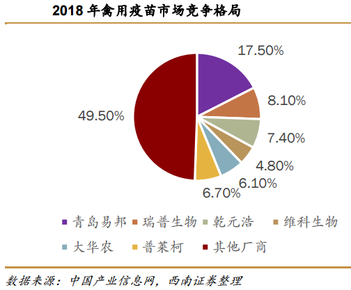 2018年中国禽用疫苗的市场规模在76亿元左右,其中市场规模两大疫苗单品分别是H5-H7型三价禽流感疫苗和H9型禽流感疫苗。2019年1月公司获批H5-H7禽流感疫苗,给公司带来新的利润增长点。目前拥有H5-H7型禽流感疫苗的厂商一共10家,其中最大的生产厂商是青岛易邦。从市场竞争格局来看,公司是仅次于青岛易邦的禽用疫苗生产厂商。天风证券测算,在2019年及未来2-3年禽疫苗市场空间有望提升30%,H5+H7禽流感疫苗市场空间有望提升70%。