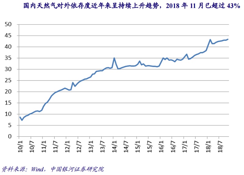 根据发改委数据,2018年中国天然气表观消费量2803亿立方米,同比增长18.1%。而根据统计局数据,2018年天然气勘探开采利用力度不断加大,天然气产量增长明显,全年生产天然气1610亿立方米,同比增长7.5%;2018年全年进口天然气9039万吨,同比增长31.9%,进口量与生产量之比为0.77:1。银河证券指出,虽然我国目前存在较大的天然气缺口,但随着煤改气推进及工业用气增加,国内天然气消费量仍将保持快速增长趋势。