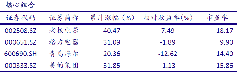 银河证券看好两条主线:①业绩确定性较强的白电龙头企业美的集团(000333.SZ)、格力电器(000651.SZ)和青岛海尔(600690.SH);②估值处于低位的厨电龙头企业老板电器(002508.SZ)。