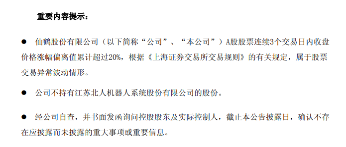 仙鹤股份3月27日发布股票交易异常波动公告称,经自查,公司不持有江苏北人机器人系统股份有限公司的股份。公司实际控制人间接持有江苏北人机器人系统股份有限公司的股份。另,本公司监事张久海担任江苏北人机器人系统股份有限公司的董事,非本公司委派。