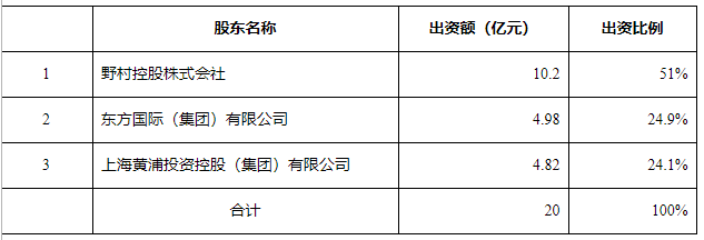 野村东方国际证券有限公司注册地为上海市,注册资本为人民币20亿元,业务范围为证券经纪、证券投资咨询、证券自营、证券资产管理,股东包括野村控股株式会社出资10.2亿元,占比51%;东方国际(集团)有限公司出资4.98亿元,占比24.9%;上海黄浦投资控股(集团)有限公司出资4.82亿元,占比24.1%。