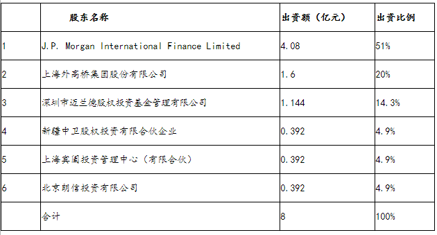 摩根大通证券(中国)公司注册地为上海市,注册资本为人民币8亿元,业务范围为证券经纪、证券投资咨询、证券自营、证券承销与保荐,股东包括J.P. Morgan International Finance Limited(出资比例51%),上海外高桥集团股份有限公司(出资比例20%),深圳市迈兰德股权投资基金管理有限公司(出资比例14.3%),新疆中卫股权投资有限合伙企业、上海宾阖投资管理中心(有限合伙)、北京朗信投资有限公司均出资比例4.9%。