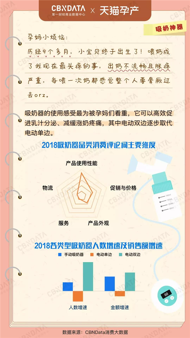 作为孕晚期及产后消费者需求对最高的“孕产用品”,缓解产妇们涨奶、腰酸等生理反应是关键。根据CBNData《报告》显示,作为近年来孕妈中的大热产品,吸奶器引领了线上孕产用品行业的快速增长,其中“电动双边”正逐渐取代“电动单边”,成为推动电动吸奶器品类发展的主动力。而这与消费者体验最注重的“便捷性”和“使用感受”不无关系。