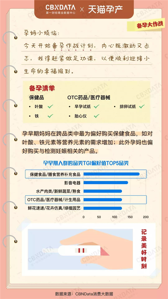 当养生青年们升级当了妈,营养保健品自不会“缺席”。根据CBNData《报告》显示,备孕期以及孕早期消费中已呈现出孕产消费者对保健食品的购买偏好。其中,孕前6个月的消费人群更注重营养均衡调理身体;而孕早期消费人群则对叶酸、铁元素等营养元素需求显著,此外她们还较多购买早孕试纸、胎心仪及排卵试纸等与检测妊娠相关的产品。
