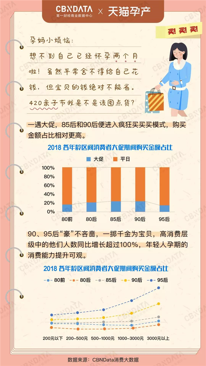 2019年4月2日,第一财经商业数据中心(CBNData)联合天猫孕产发布《孕产行业消费者洞察及品类发展趋势》(下文简称CBNData《报告》),基于CBNData消费大数据,以线上孕产行业中“吃”“穿”“用”“洗护”“服务”五大品类为研究范围,以线上孕产消费人群为研究对象,分代际和孕周期洞察她们的消费行为,并分析线上孕产消费行业的现状以及未来发展趋势。