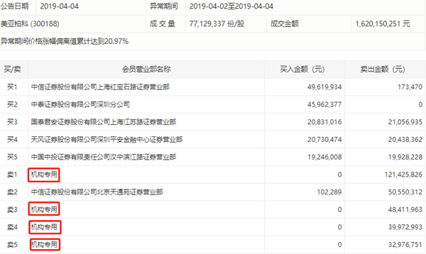 在卖出排行榜上,机构卖出最多的美亚柏科有4家机构卖出,净卖出金额24278.75万元。