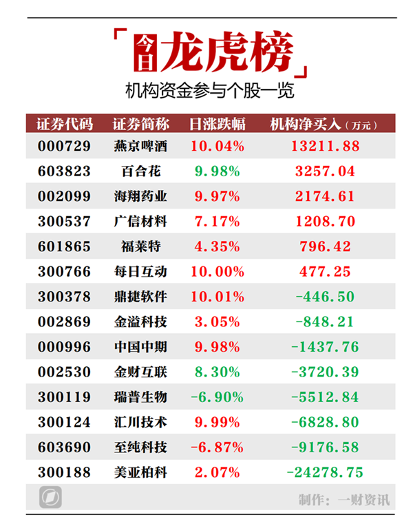 当天机构净买入前三的股票分别是燕京啤酒、百合花、海翔药业,净买入金额分别为1.3亿元、3257万元、2174万元。
