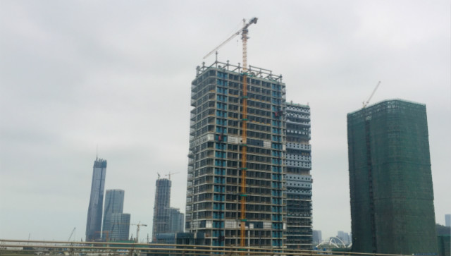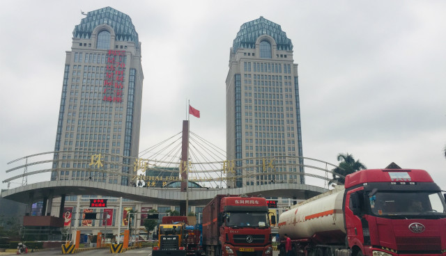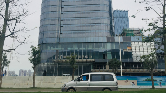 驱车前往横琴岛,可以很快看到珠海保税区,货柜车正在运作,两栋建筑非常显眼。
