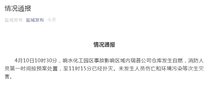 据盐城发布微信公众号最新消息,4月10日10时30分,响水化工园区事故影响区域内瑞普公司仓库发生自燃,消防人员第一时间按预案处置,至11时15分已经扑灭。未发生人员伤亡和环境污染等次生灾害。