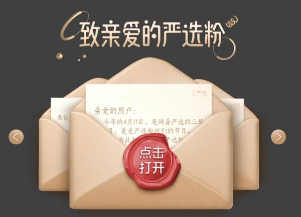 除了用丰富多样的优惠带给粉丝实惠外,网易严选也通过各团队负责人的亲笔信与粉丝建立情感的连接。二十多封信,分别来自严选CEO、质检团队、供应链团队、各商品品类的负责人,他们一一写下严选三年成长的感悟,对粉丝诉说彼此陪伴的感激。当粉丝登录严选官网、APP、或者收到严选包裹时,便能收到来自严选内部的这份感谢。