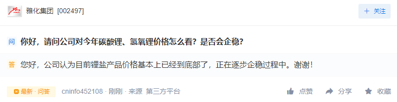 雅化集团4月16日在互动平台表示,公司认为目前锂盐产品价格基本上已经到底部了,正在逐步企稳过程中。