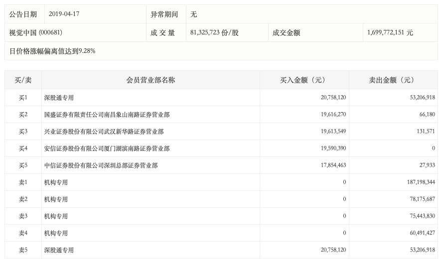 17日,视觉中国涨停再登龙虎榜,数据显示卖出大部队仍然是机构,机构仍然多数在“出逃”,前四名机构共卖出4亿元。不过深股通同时出现在买入席位第一和卖出席位第五,和此前净买入的情况又发生变化。