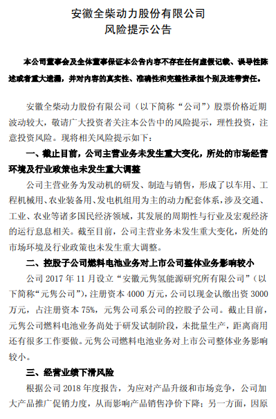 17日晚间,全柴动力再度提示风险称,截至目前,子公司元隽公司燃料电池业务尚处于研发试制阶段,未批量生产,距离商用还有很多工作要做。元隽公司燃料电池业务对上市公司整体业务影响较小。