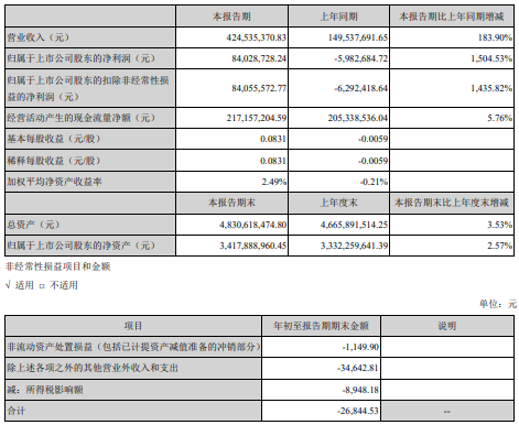 4月18日晚间,深深房A发布一季报,一季度营收为4.25亿元,同比增长183.9%;净利为8403万元,上年同期亏损598万元,同比增长1504.53%。