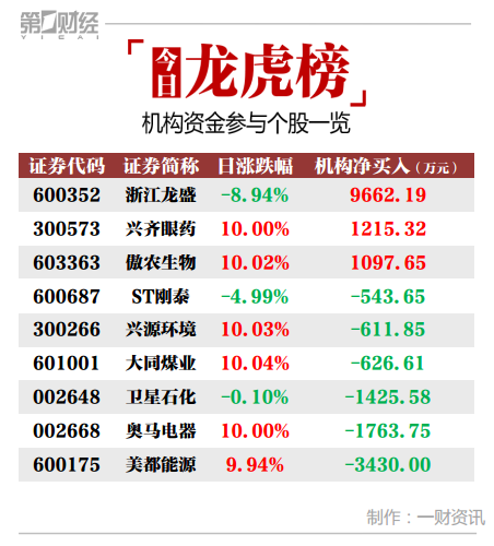 当天机构净买入前三的股票分别是浙江龙盛、兴齐眼药、傲农生物,净买入金额分别为9662万元、1215万元、1098万元。