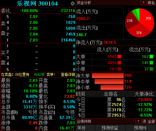 周二早盘,乐视网开盘再度跌停,报2.03元/股,总市值仅剩80.99亿元。