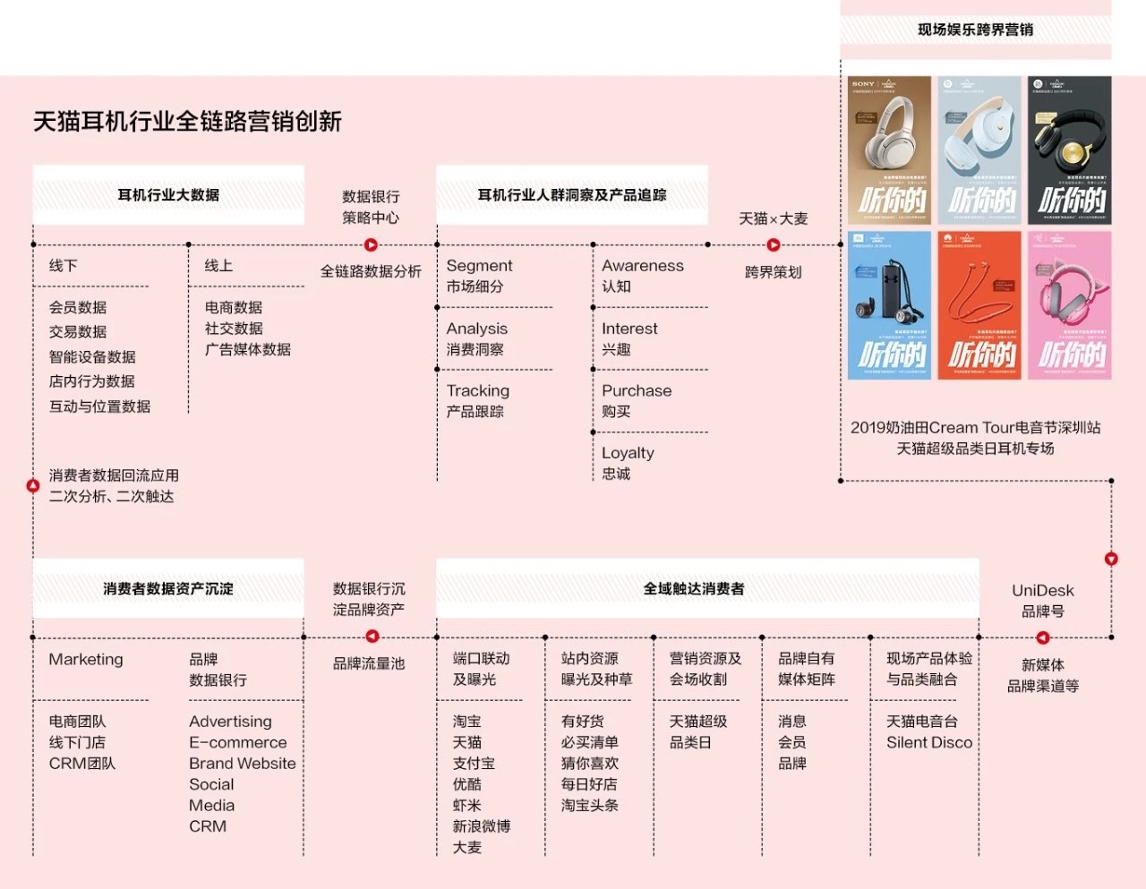 这不仅体现于线上。“2019奶油田CreamTour电音节深圳站天猫超级品类日耳机专场”就是天猫在线下“挖掘”出的一个触达耳机用户的绝妙“沟通链路”。