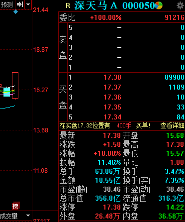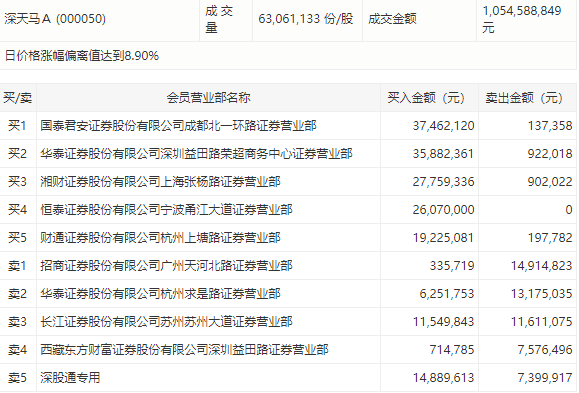 截至今日收盘,深天马A报17.38元,涨10.00%,偏离值8.90%,换手率3.47%,成交额超10亿元。