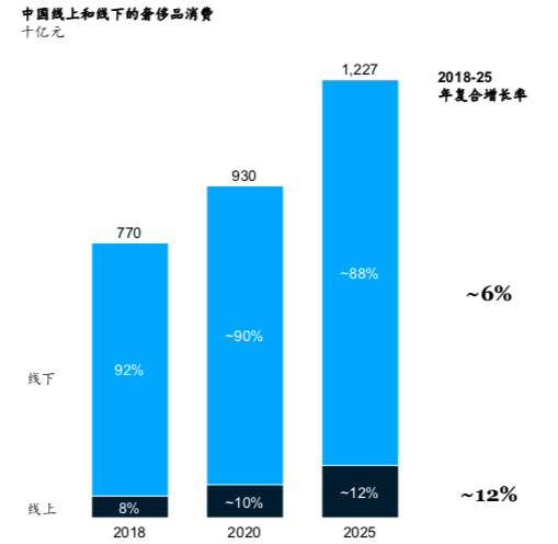 报告认为,线下渠道将会继续主导今后的奢侈品销售而不是电商和线上社交购物渠道,前者未来几年的复合年均增长率将达到6%左右。线上销售,到2025年将比现在的规模增长2~3倍,相当于届时中国1.2万亿元人民币奢侈品市场规模的八分之一。