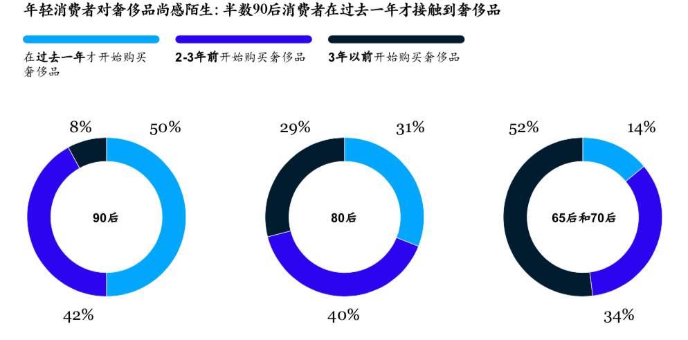 尽管中国社会正在加速老龄化,但麦肯锡全球资深董事合伙人泽沛达(Daniel Zipser)对对第一财经表示,这对奢侈品销售增长的影响并不明显。例如根据手机、汽车等品类的数据,虽然整体市场增长趋缓,但实际上高端表现依然强劲,奢侈品也会保持这个势头。社会老龄化对奢侈品来说影响并不大,因为虽然80后和90后是中国奢侈品市场的主力,但中国消费者整体来说开始购买奢侈品时间并不长(半数的“90后”和31%的“80后”奢侈品消费者在过去的一年才开始购买人生中的第一件奢侈品,近半数的“65后”和“70后”也是近三年才开始购买设计师品牌)。现在的80后和90后消费者会继续增加奢侈品消费,而且也会有更多新的年轻消费者加入到奢侈品购买行列中来。