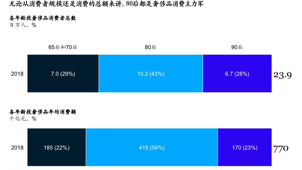 以“80后”和“90后”为代表的年轻一代,分别占到奢侈品买家总量的43%和28%,分别贡献了中国奢侈品总消费的56%和23%。
