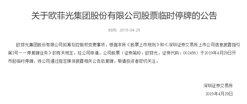 欧菲光今日公告称,拟筹划控制权变更事项,于2019年4月29日开市起临时停牌,待公司通过指定媒体披露相关公告后复牌,敬请投资者密切关注。上周五,欧菲光封死在了跌停板上,报12.07元人民币,创两个月新低。