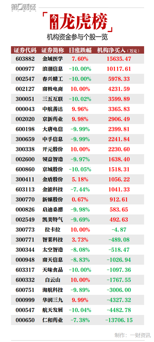 当天机构净买入前三的股票分别是金域医学、浪潮信息、春兴精工,净买入金额分别为1.56亿元、1.01亿元、5978万元。