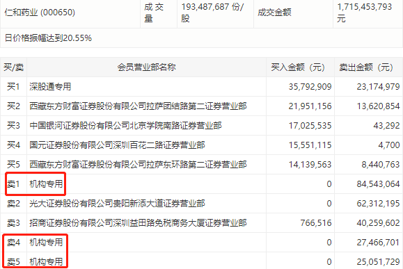 在卖出排行榜上,机构卖出最多的仁和药业有3家机构进行了卖出,合计净卖出金额1.37亿元。