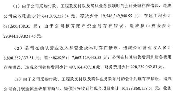 康美药业昨晚发布会计差错更正说明,通过企业自查后,对2017年财务报表进行重述,由于公司核算账户资金时存在错误,造成货币资金多计299.44亿元。同时,公司营业收入多计88.98亿元,营业成本多计76.62亿元。由于公司采购付款、工程款支付以及确认业务款项时的会计处理存在错误,造成公司合并现金流量表销售商品、提供劳务收到的现金项目多计102.99亿元。