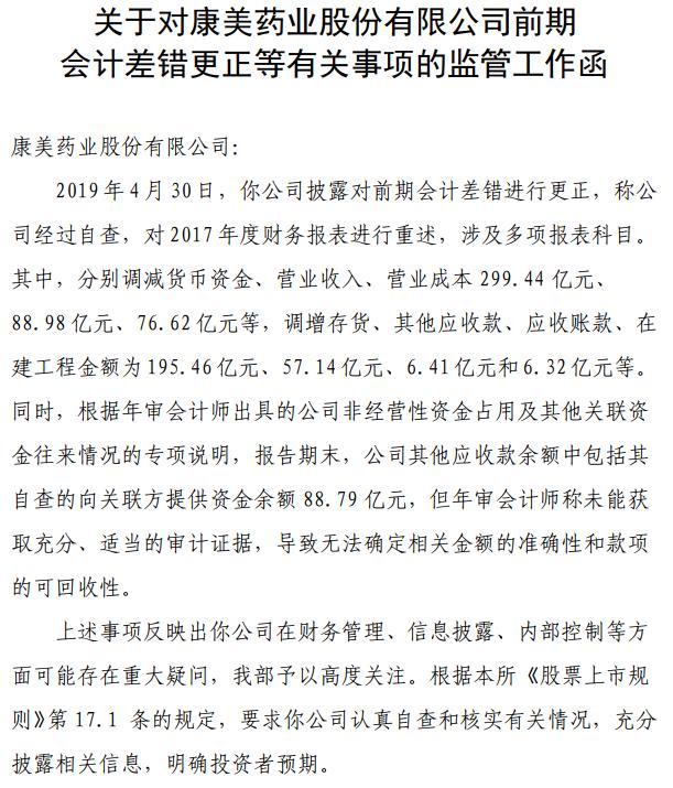 4月30日晚间,上交所就康美药业前期会计差错更正等有关事项发出监管工作函。上交所要求公司认真核查本次前期会计差错更正所涉及的具体事项,包括但不限于涉及差错调整的交易背景、对象及其关联关系、会计差错发生的时点、发生差错的具体原因和责任人等。上交所同时要求公司充分核实本次会计差错更正是否涉及对 2017 年度以外的以前年度财务报表更正事项,是否存在其他应披露未披露的重大会计差错更正或调整事项。