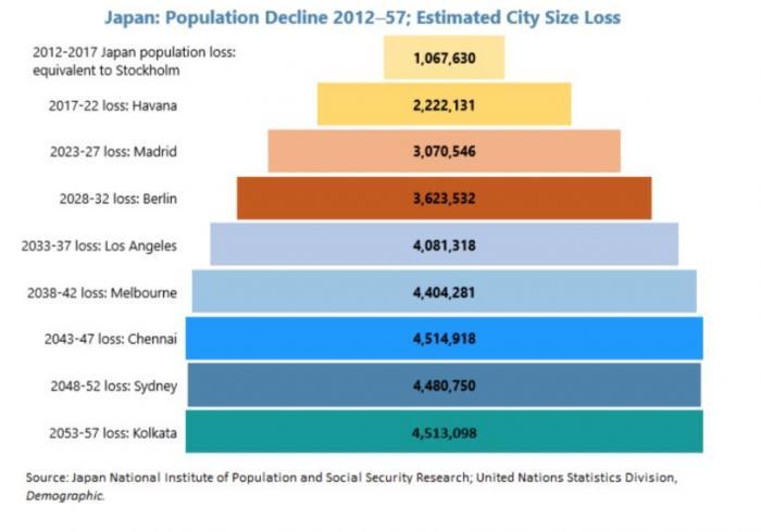 (日本人口2012到2057年之间的下跌规模预测来源:IMF(国际货币基金组织)报告)
