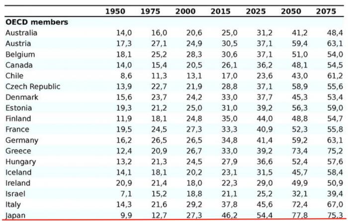 “抚养比”即一个社会65岁及65岁以上对劳动人口(20-64岁)的比例,据OECD(经济合作与发展组织)公布的报告显示,1950年日本的抚养比为9.9%,到2000年为27.3%,到2015年增长到了46.2%,OECD预测,这一数字到2050年将增至77.8%。