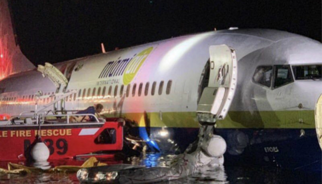 当地时间5月3日晚,美国迈阿密国际航空一架737-800飞机在佛罗里达州杰克逊维尔国际机场降落时冲出跑道,滑入到机场附近的圣约翰河中。