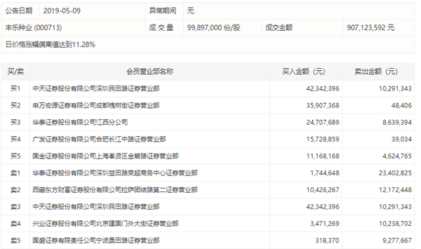 昨日丰乐种业报收10.27元,涨跌幅为9.96%,偏离值达11.28%,换手率33.42%,成交额9.07亿元。盘后数据显示,实力资金大量抛售。中天证券深圳民田路今日买入4234万元并卖出1029万元,华泰证券深圳益田路荣超商务中心卖出2340万元。