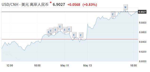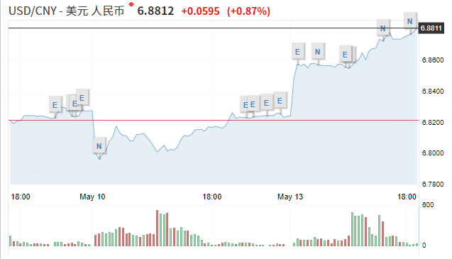 5月13日,在岸人民币兑美元跌破6.88关口,创近五个月以来最低水平,日内跌超600点。截至发稿,离岸人民币兑美元跌600个基点报6.9039,这也意味着,离岸人民币对美元汇率已经抹去了今年以来的全部涨幅。