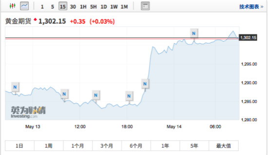 COMEX黄金期货隔夜收涨1.07%,报1301.2美元/盎司。金价创下2月份以来最大涨幅,冲上1300美元/盎司大关。