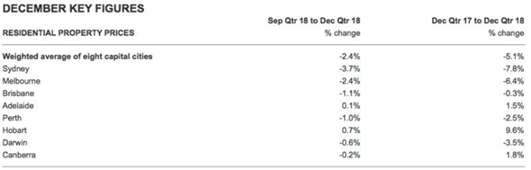 就2018年的最后一个季度而言,住宅房产价格平均跌势略微收敛至2.4%,而悉尼和墨尔本分别下跌3.7%和2.4%。