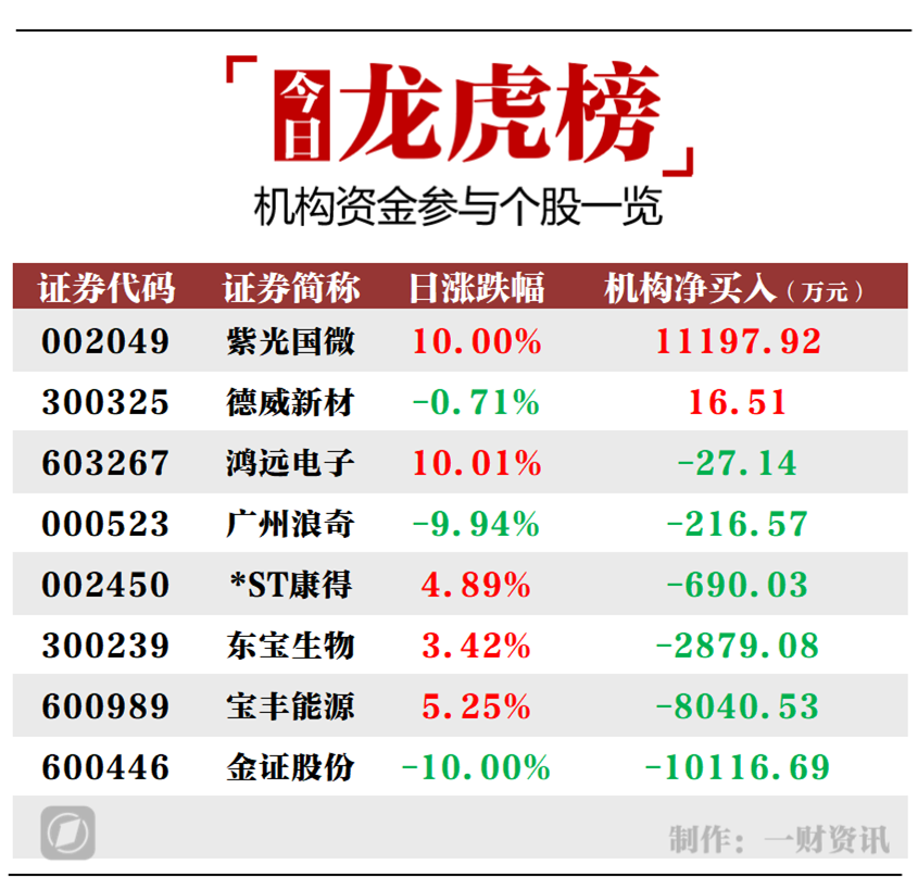 当天机构净买入的两只股票分别是紫光国微、德威新材,净买入金额分别为1.11亿元、16万元。当天机构净卖出前三的股票分别是金证股份、宝丰能源、东宝生物,净流出金额分别是1.01亿元、8040万元、2879万元。