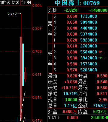 港股方面,中国稀土5月21日当天暴涨,刷新15个月高位后,昨日跌超27%,今天股价高开,盘中窄幅震荡,截至发稿,股价涨10.71%。