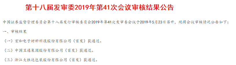 证监会网站23日消息,第十八届发行审核委员会2019年第41次发审委会议于当日召开,宏和电子材料科技股份有限公司、中国卫通集团股份有限公司、浙江大胜达包装股份有限公司首发事项获通过。