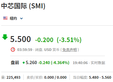 5月24日,中芯国际美股盘前跌超4%,截至发稿报5.26美元。