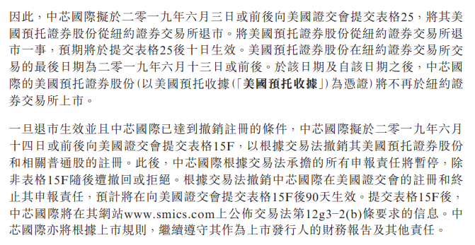 中芯国际今日宣布将申请自愿从纽交所退市。中芯国际公告称,本公司已于美国东部时间5月24日通知纽约证券交易所,将根据一九三四年美国证券交易法(经修订)申请自愿将其美国预托证券股份从纽约证券交易所退市,并撤销该等美国预托证券股份和相关普通股的注册。